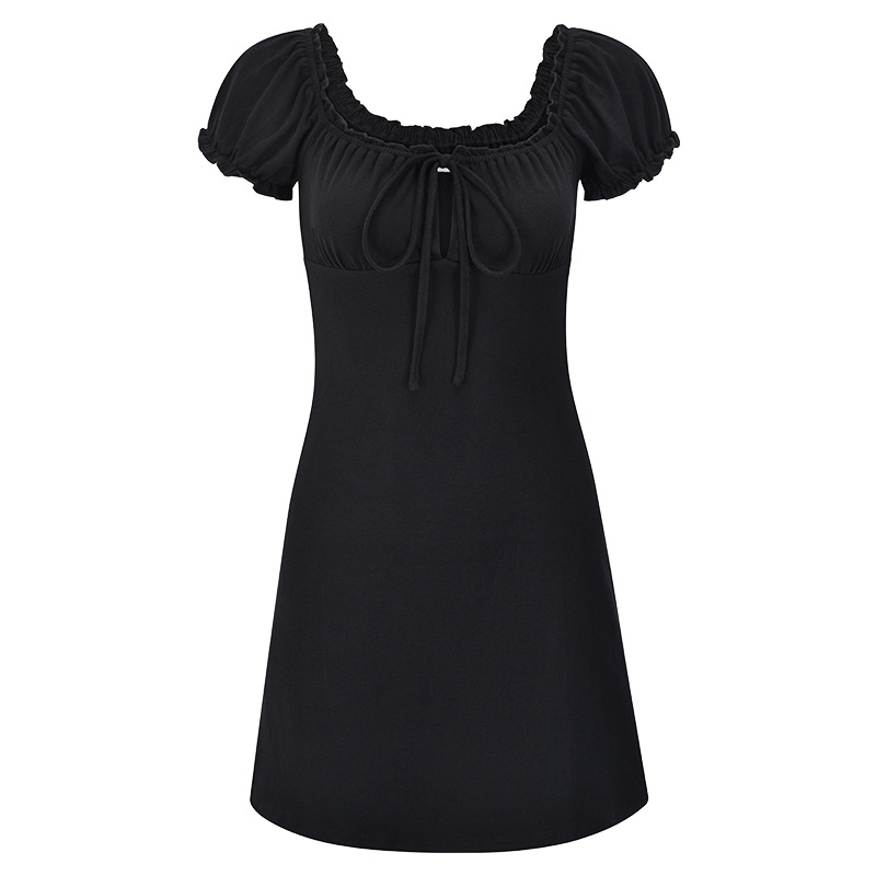 American Retro Chest Hollow Out Tied Puff Sleeve Black Dress